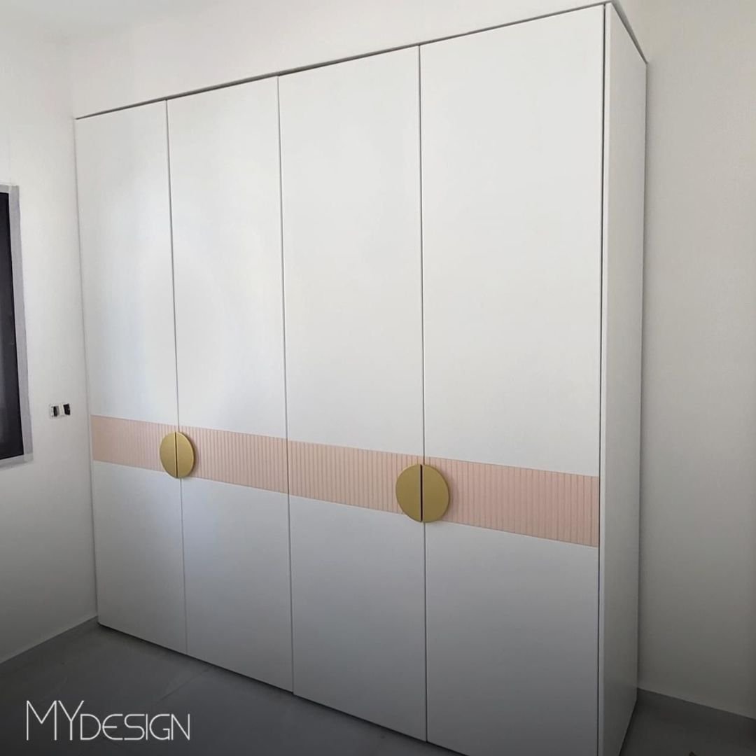 החלק המרכזי של החזיתות כולל פס אופקי בצבע ורוד בהיר עם טקסטורה עדינה, המשתלב בהרמוניה עם הידיות החיצוניות העגולות בצבע זהב.