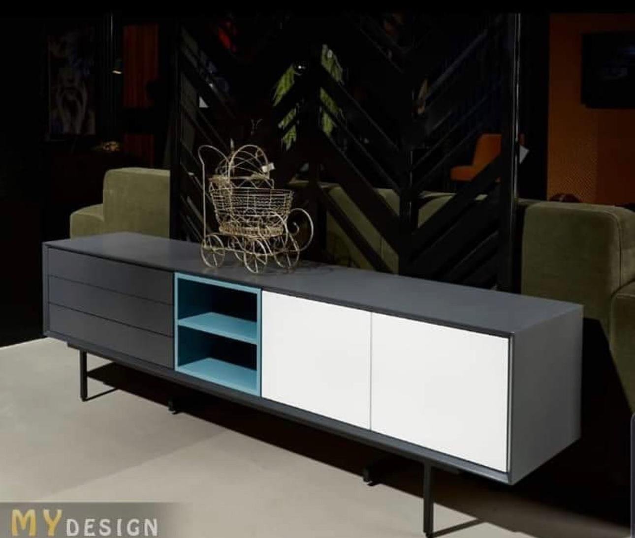 המזנון כולל מגירות סגורות ומדפים פתוחים, ומבנהו הקומפקטי והקליל עומד על רגליים גבוהות שמקלות על הניקוי והתחזוקה.