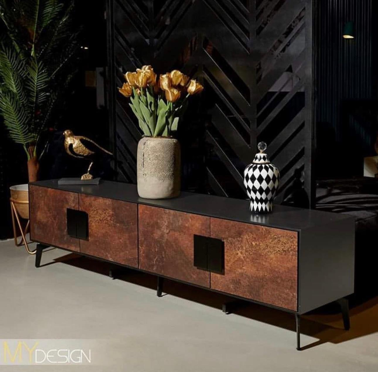 המזנון בצבע שחור עם דלתות חומות משדר תחושת עיצוב מודרני ומוקפד, כשהקונטרסט בין השחור לחום יוצר מראה אלגנטי.